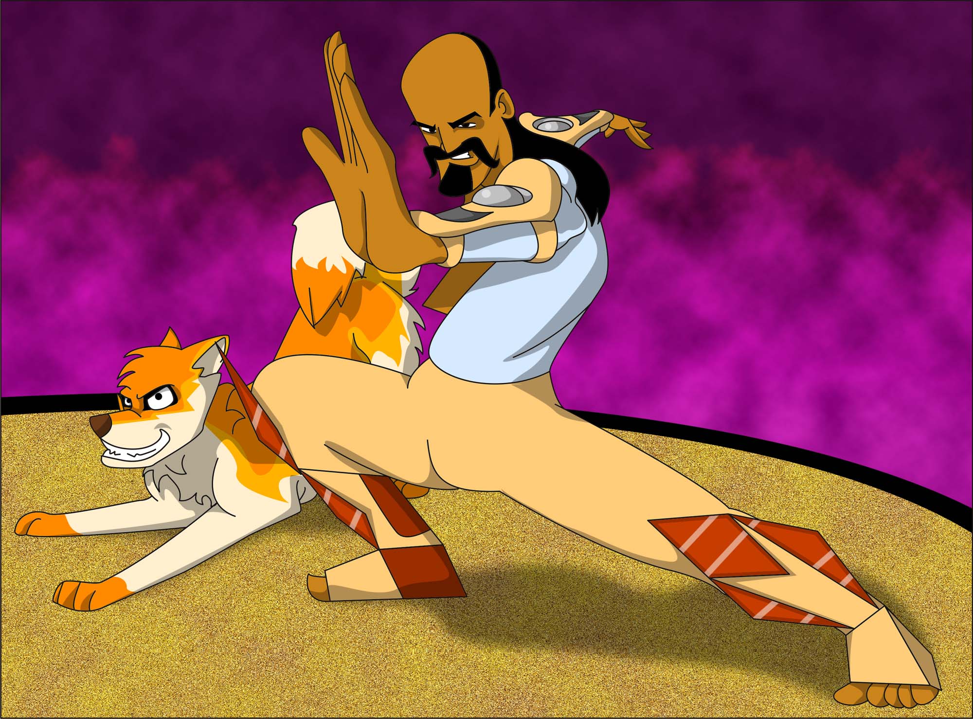 Remo espera pacientment l'atac del seu adversari per aturar-lo amb el bastó i passar al contratac. Mentrestant, l'infatigable Chiun, el seu gos, no para de bordar al rival per provocar-lo. Guaguaguaguaguaguaguaguaguaguagua!