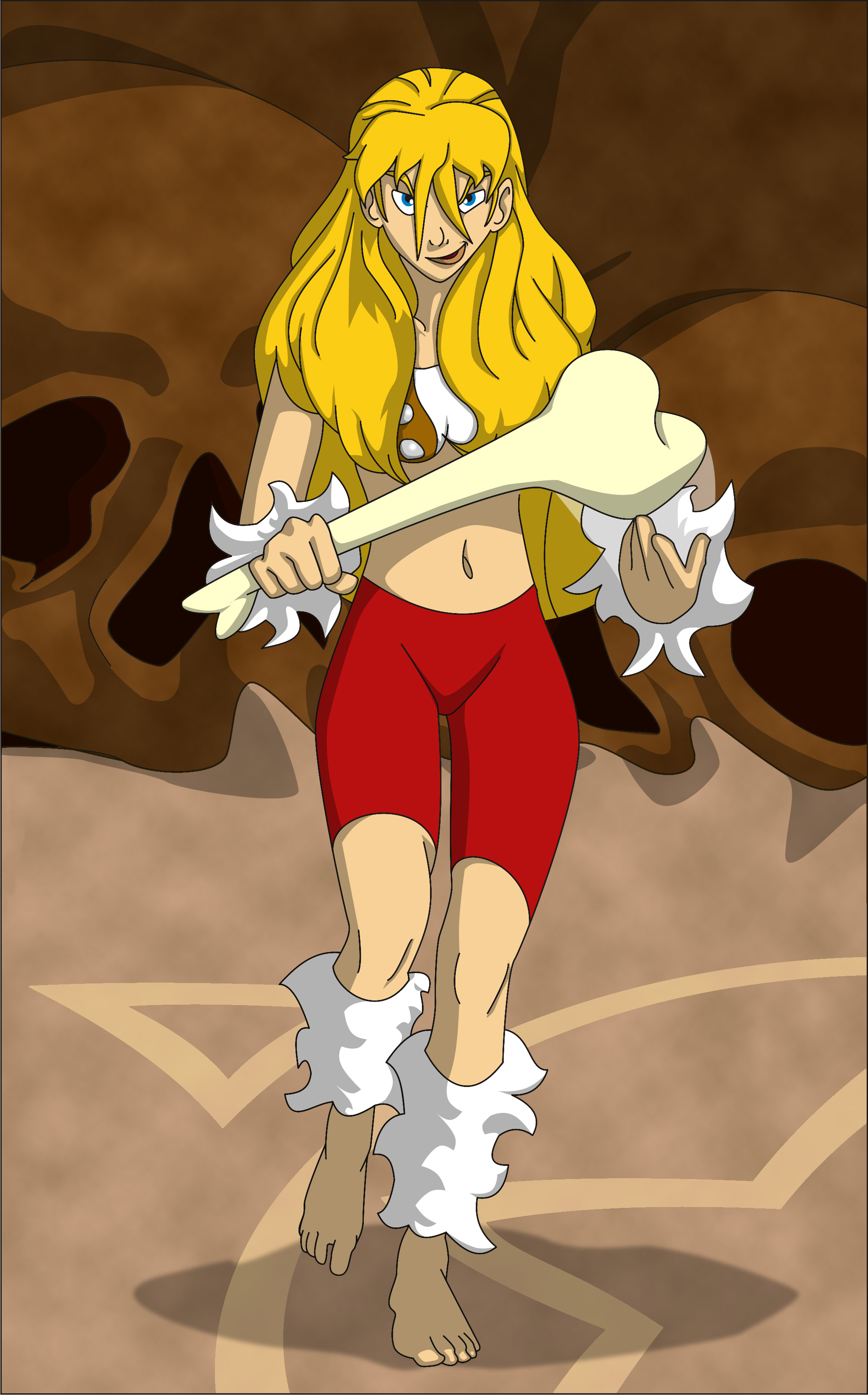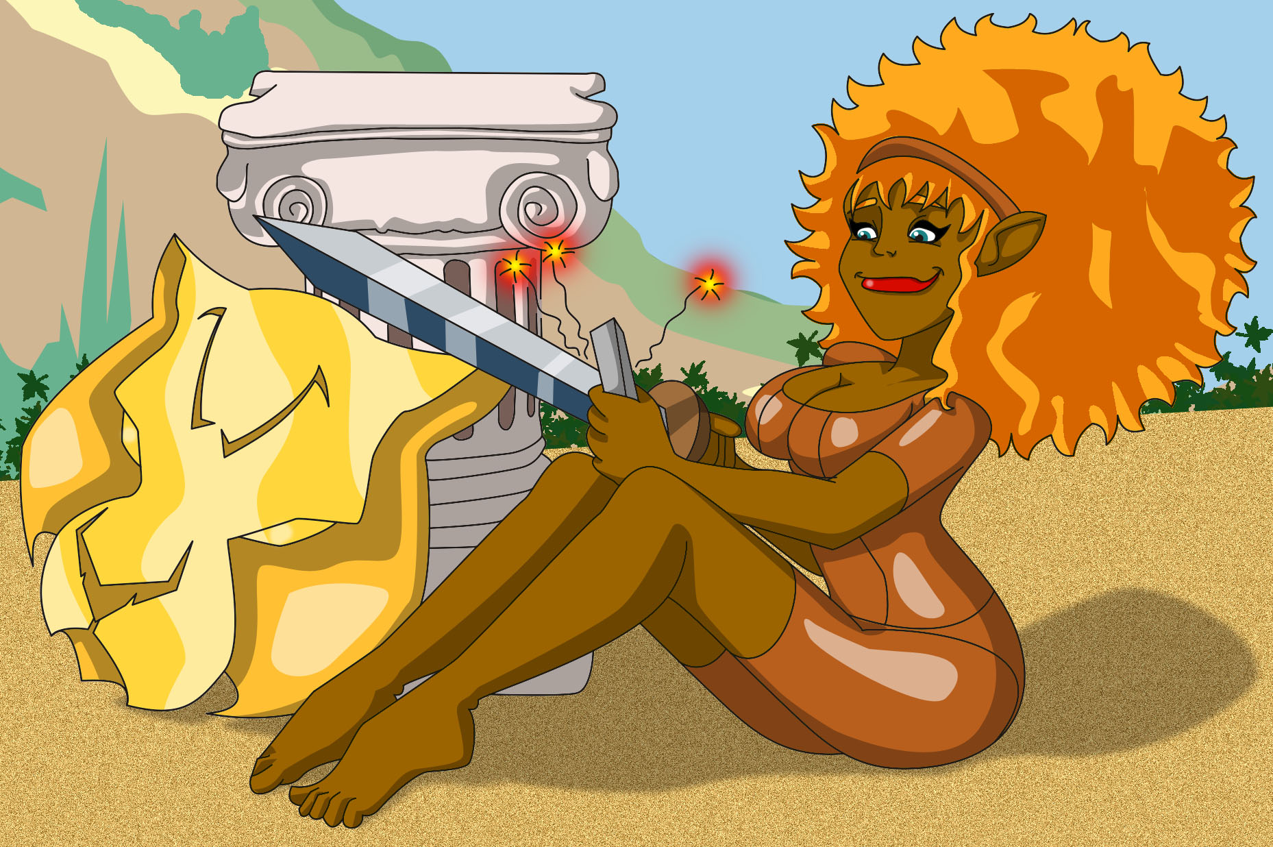 La Tigresseta, amb l'escut recolzat a una columna del cami i esmolant la "gladius" (l'espadón del joc). Total, sempre acaba llançant-les.