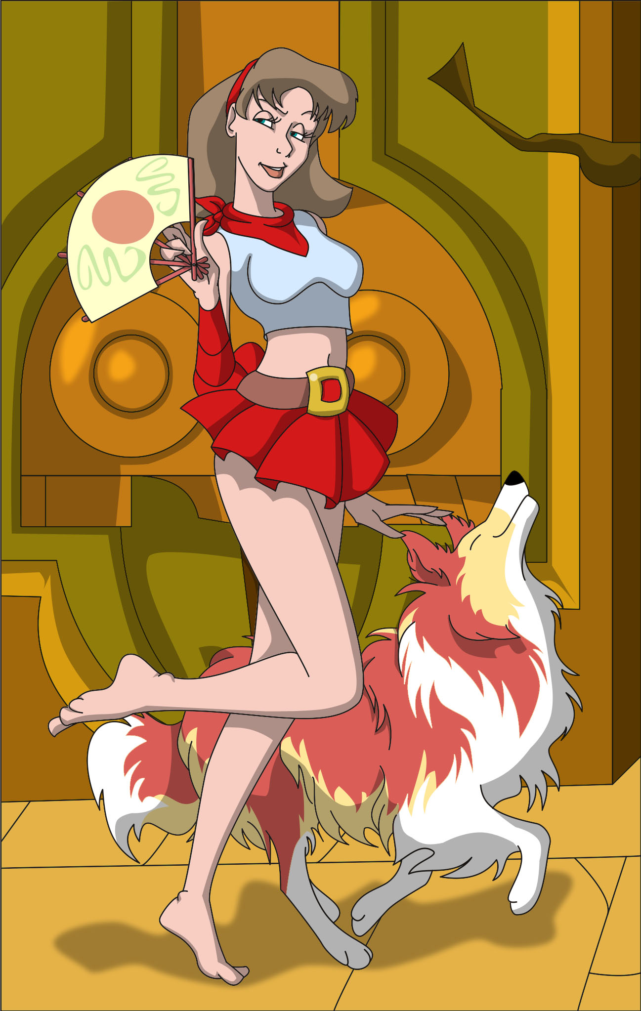 Panxa Contenta no surt guanyant cap combat, perquè els perd tots. Així que posa per la càmera, surt amb la seva gossa Cal·líope (vaja dues!) i aquell ventall tan meravellós que tan sols fa 2 punts d'atac (snif).